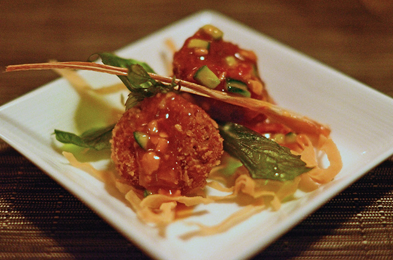 - Thiptara (The Palace Hotel) Thod Maan Goong – Thai deep fried prawn cake served with diced cucumber, peanut, sweet chilli sauce. Not very exciting, but deliciously moreish